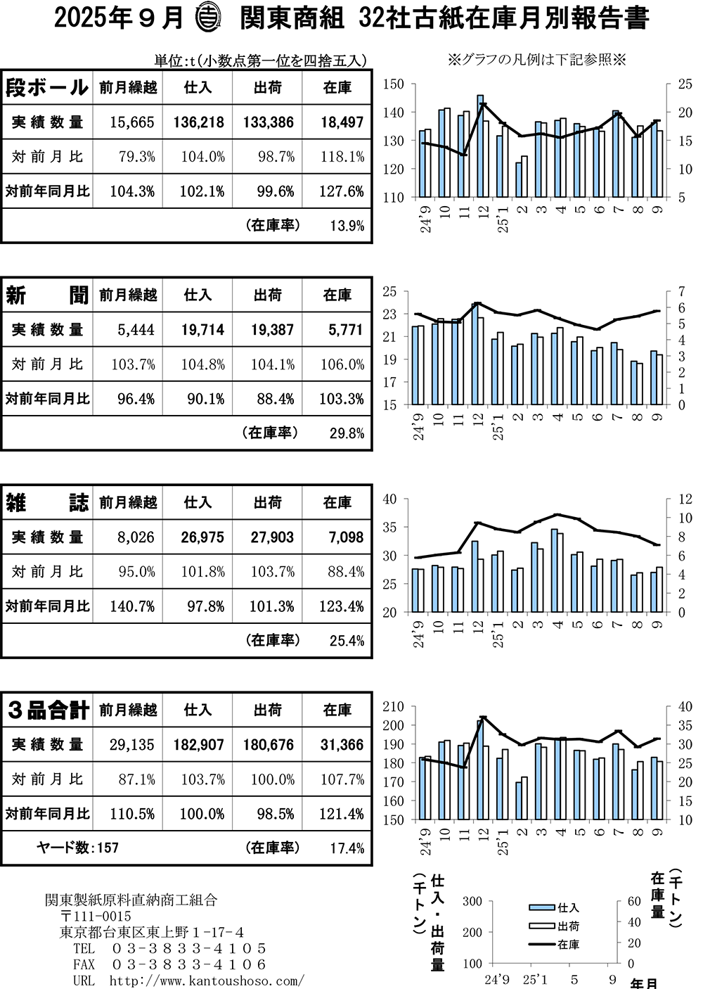 古紙在庫月別報告書 2025年9月度 関東商組32社の古紙在庫月別報告です。 エクセル版_古紙在庫月別報告書 こちらより過去の古紙在庫月別報告書がご覧になれます。 古紙在庫月別報告書(過去) 2025年 9月度 2025年 8月度 2025年 7月度 2025年 6月度 2025年 5月度 2025年 4月度 2025年 3月度 2025年 2月度 2025年 1月度 2024年 12月度 2024年 11月度 2024年 10月度 2024年 9月度 2024年 8月度 2024年 7月度 2024年 6月度 2024年 5月度 2024年 4月度 2024年 3月度 2024年 2月度 2024年 1月度 2023年 12月度 2023年 11月度 2023年 10月度 2023年 9月度 2023年 8月度 2023年 7月度 2023年 6月度 2023年 5月度 2023年 4月度 2023年 3月度 2023年 2月度 2023年 1月度 2022年 12月度 2022年 11月度 2022年 10月度 2022年 9月度 2022年 8月度 2022年 7月度 2022年 6月度 2022年 5月度 2022年 4月度 2022年 3月度 2022年 2月度 2022年 1月度 2021年 12月度 2021年 11月度 2021年 10月度 2021年 9月度 2021年 8月度 2021年 7月度 2021年 6月度 2021年 5月度 2021年 4月度 2021年 3月度 2021年 2月度 2021年 1月度 2020年 12月度 2020年 11月度 2020年 10月度 2020年 9月度 2020年 8月度 2020年 7月度 2020年 6月度 2020年 5月度 2020年 4月度 2020年 3月度 2020年 2月度 2020年 1月度 2019年 12月度 2019年 11月度 2019年 10月度 2019年 9月度 2019年 8月度 2019年 7月度 2019年 6月度 2019年 5月度 平成31 4月度 平成31 3月度 平成31 2月度 平成31 1月度