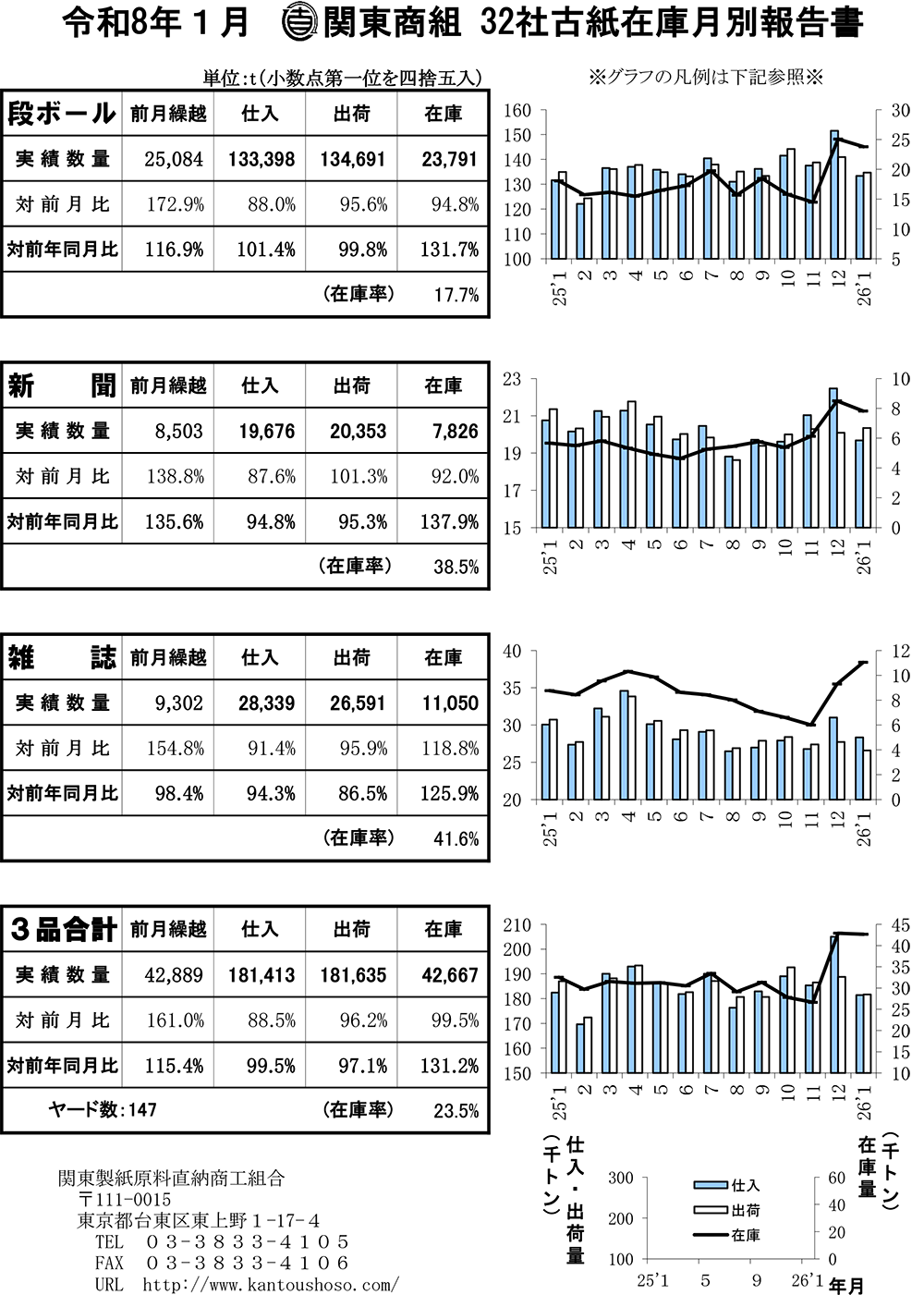古紙在庫月別報告書 2026年1月度 関東商組32社の古紙在庫月別報告です。 エクセル版_古紙在庫月別報告書 こちらより過去の古紙在庫月別報告書がご覧になれます。 古紙在庫月別報告書(過去) 2026年 1月度 2025年 12月度 2025年 11月度 2025年 10月度 2025年 9月度 2025年 8月度 2025年 7月度 2025年 6月度 2025年 5月度 2025年 4月度 2025年 3月度 2025年 2月度 2025年 1月度 2024年 12月度 2024年 11月度 2024年 10月度 2024年 9月度 2024年 8月度 2024年 7月度 2024年 6月度 2024年 5月度 2024年 4月度 2024年 3月度 2024年 2月度 2024年 1月度 2023年 12月度 2023年 11月度 2023年 10月度 2023年 9月度 2023年 8月度 2023年 7月度 2023年 6月度 2023年 5月度 2023年 4月度 2023年 3月度 2023年 2月度 2023年 1月度 2022年 12月度 2022年 11月度 2022年 10月度 2022年 9月度 2022年 8月度 2022年 7月度 2022年 6月度 2022年 5月度 2022年 4月度 2022年 3月度 2022年 2月度 2022年 1月度 2021年 12月度 2021年 11月度 2021年 10月度 2021年 9月度 2021年 8月度 2021年 7月度 2021年 6月度 2021年 5月度 2021年 4月度 2021年 3月度 2021年 2月度 2021年 1月度 2020年 12月度 2020年 11月度 2020年 10月度 2020年 9月度 2020年 8月度 2020年 7月度 2020年 6月度 2020年 5月度 2020年 4月度 2020年 3月度 2020年 2月度 2020年 1月度 2019年 12月度 2019年 11月度 2019年 10月度 2019年 9月度 2019年 8月度 2019年 7月度 2019年 6月度 2019年 5月度 平成31 4月度 平成31 3月度 平成31 2月度 平成31 1月度