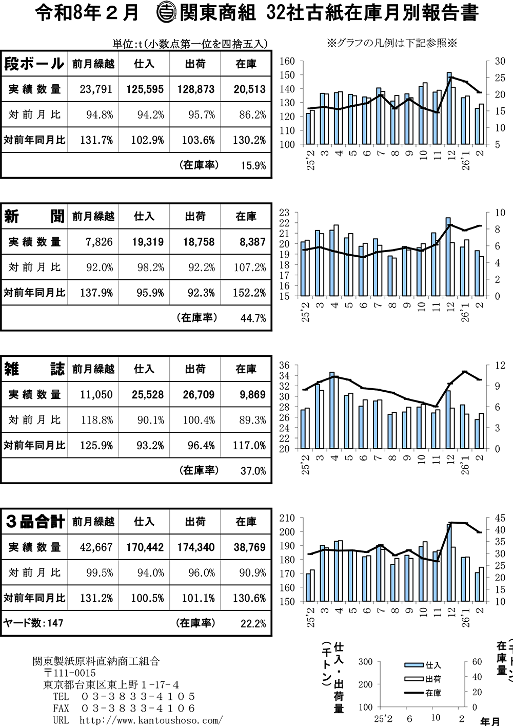 古紙在庫月別報告書 2026年2月度 関東商組32社の古紙在庫月別報告です。 エクセル版_古紙在庫月別報告書 こちらより過去の古紙在庫月別報告書がご覧になれます。 古紙在庫月別報告書(過去) 2026年 2月度 2026年 1月度 2025年 12月度 2025年 11月度 2025年 10月度 2025年 9月度 2025年 8月度 2025年 7月度 2025年 6月度 2025年 5月度 2025年 4月度 2025年 3月度 2025年 2月度 2025年 1月度 2024年 12月度 2024年 11月度 2024年 10月度 2024年 9月度 2024年 8月度 2024年 7月度 2024年 6月度 2024年 5月度 2024年 4月度 2024年 3月度 2024年 2月度 2024年 1月度 2023年 12月度 2023年 11月度 2023年 10月度 2023年 9月度 2023年 8月度 2023年 7月度 2023年 6月度 2023年 5月度 2023年 4月度 2023年 3月度 2023年 2月度 2023年 1月度 2022年 12月度 2022年 11月度 2022年 10月度 2022年 9月度 2022年 8月度 2022年 7月度 2022年 6月度 2022年 5月度 2022年 4月度 2022年 3月度 2022年 2月度 2022年 1月度 2021年 12月度 2021年 11月度 2021年 10月度 2021年 9月度 2021年 8月度 2021年 7月度 2021年 6月度 2021年 5月度 2021年 4月度 2021年 3月度 2021年 2月度 2021年 1月度 2020年 12月度 2020年 11月度 2020年 10月度 2020年 9月度 2020年 8月度 2020年 7月度 2020年 6月度 2020年 5月度 2020年 4月度 2020年 3月度 2020年 2月度 2020年 1月度 2019年 12月度 2019年 11月度 2019年 10月度 2019年 9月度 2019年 8月度 2019年 7月度 2019年 6月度 2019年 5月度 平成31 4月度 平成31 3月度 平成31 2月度 平成31 1月度